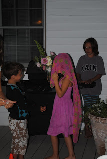 last night we were enjoying wine after dinner, relaxing on the patio when my son luc (8 years old) calls the adults to the back deck for a surprise. when we got there, chairs were set up with an aisle down the middle leading to the barbeque. he then announced, "you are invited to the wedding of deacon and esme!" d is 5 and esme is 6. gulp. (we didn't have the heart to tell them that being first cousins that sort of thing is frowned upon, not to mention illegal, but...) it was so cute. the bride wore a pink dress with a pink scarf/veil.